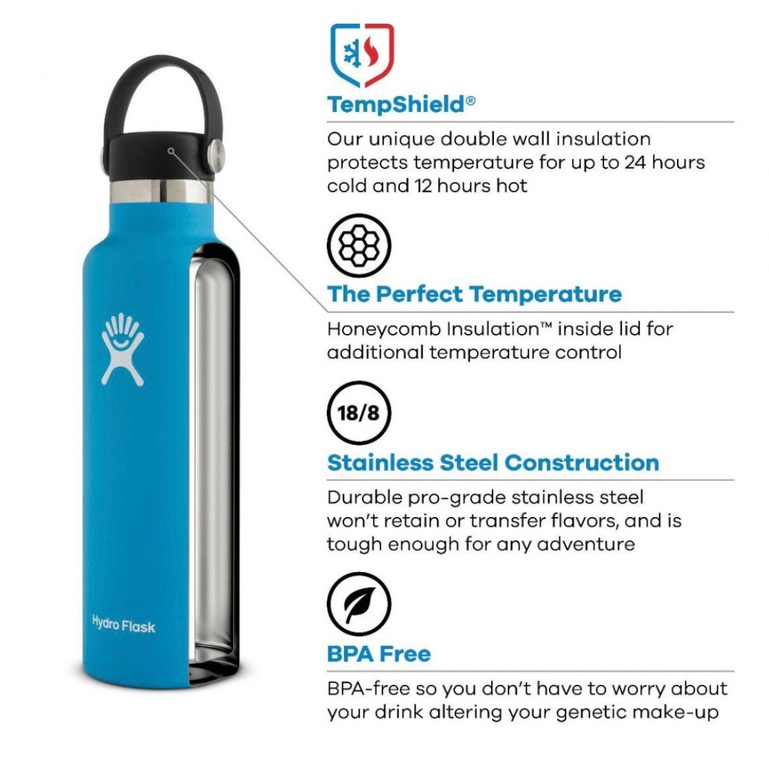 A 32 oz Wide Mouth water bottle with our leakproof Flex Straw Cap-easy to fill, easy to drink. Open it up, add your ice, and flip to sip. The insulated stainless steel keeps it cold for up to 24 hours.