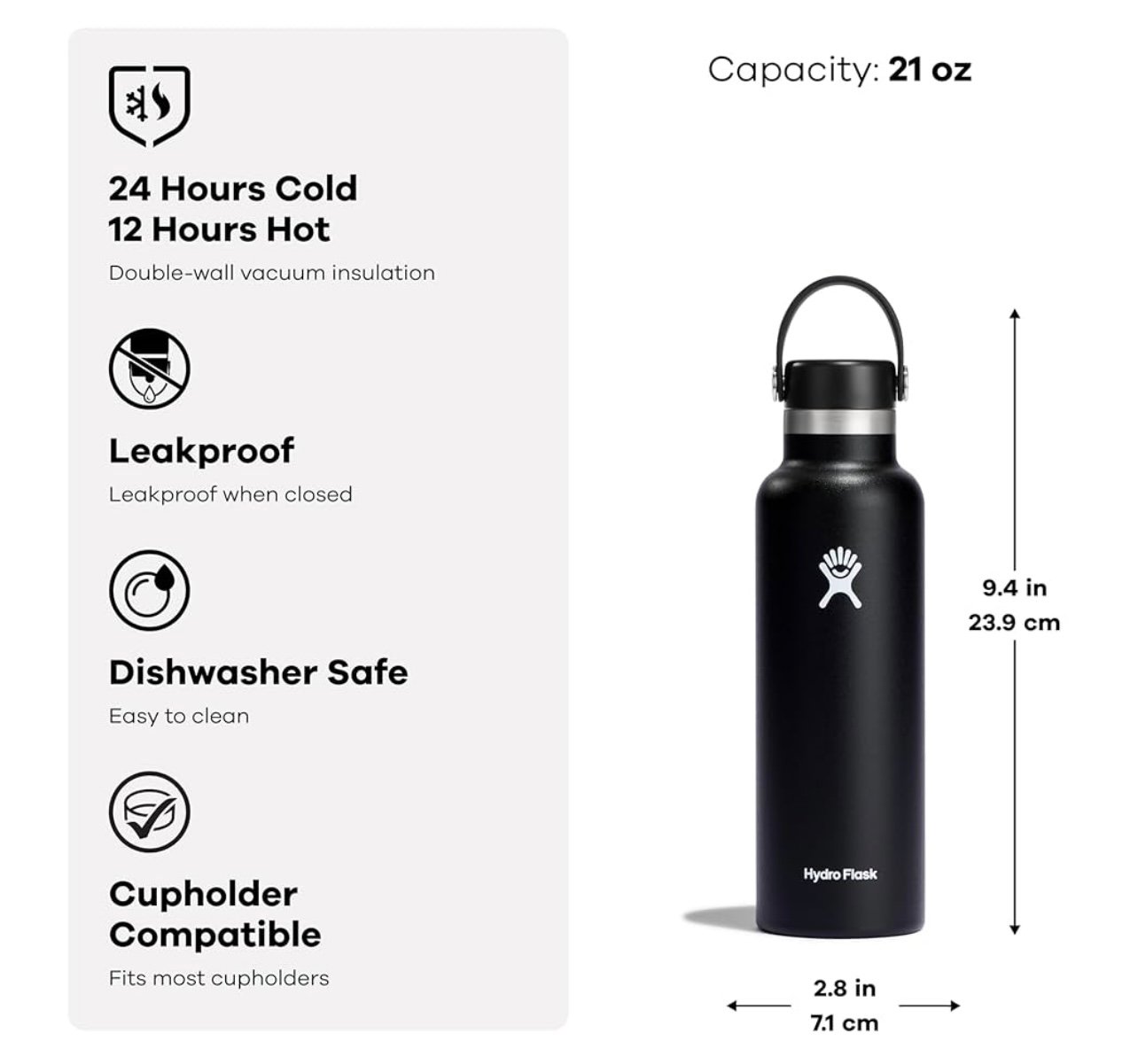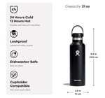 Stainless steel and cupholder compatible, the reusable, refillable 21 oz Standard Mouth insulated water bottle keeps cold drinks cold for 24 hours, hot drinks hot for up to 12 hours, and holds enough hydration for hours of fun.