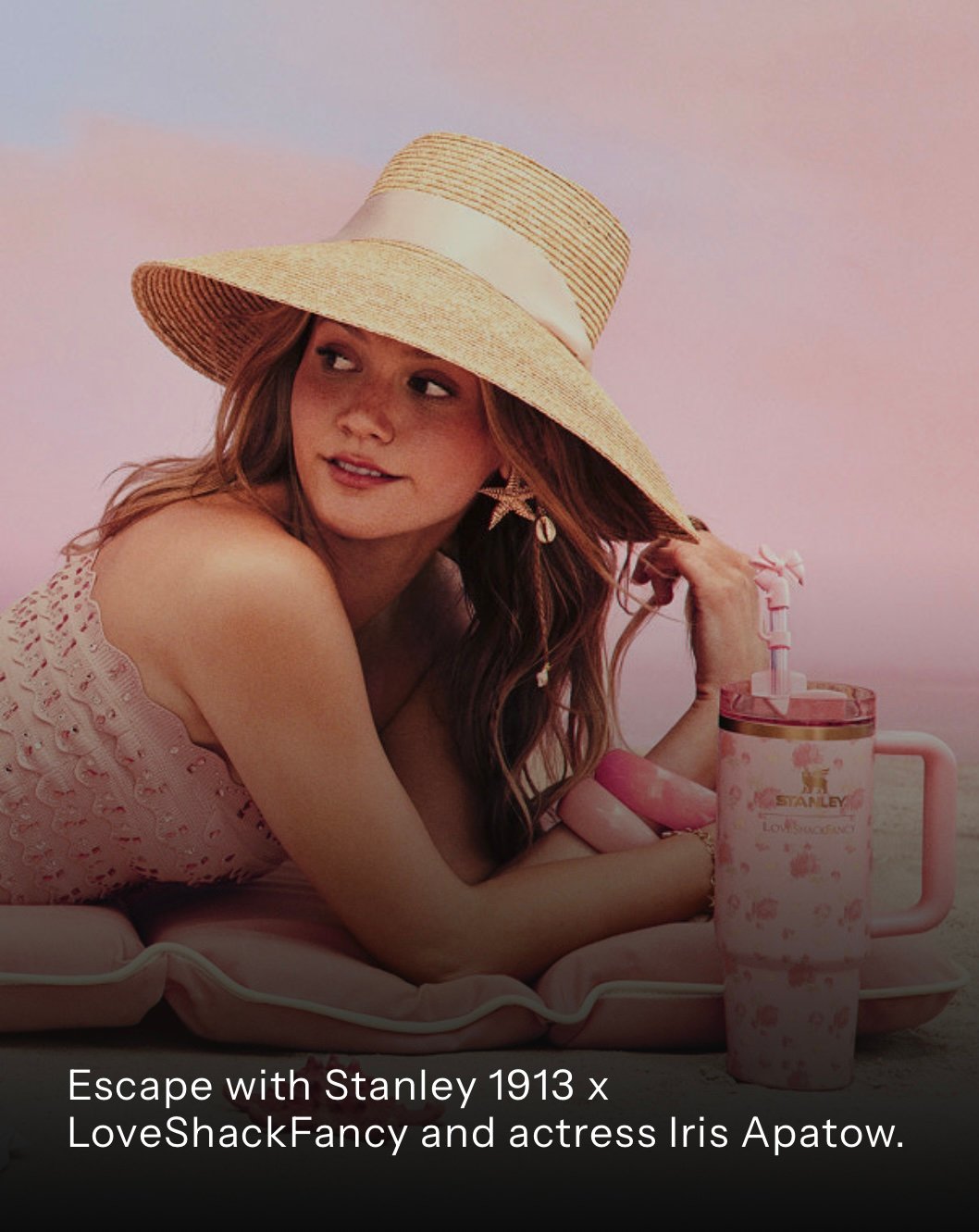Our love for pink florals goes global with the latest Stanley 1913 x LoveShackFancy collab. The Ibiza Sunset Collection introduces soft coolers in an lkat rose print that features an exclusive charm set. And each water bottle shines with a subtle and shimmery finish. For a splash of romance wherever you go.