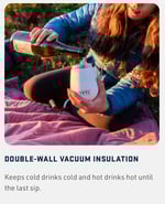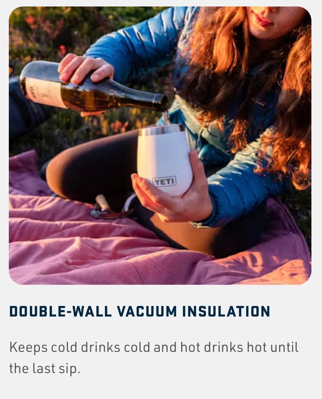 The double-wall vacuum insulation and 18/8 kitchen-grade stainless steel keeps your red or white wine at the ideal temperature. Enjoy your favorite wine outdoors with the YETI Wine Tumbler. • DuraCoat™ Color Technology is built to last with no chipping, fading or cracking